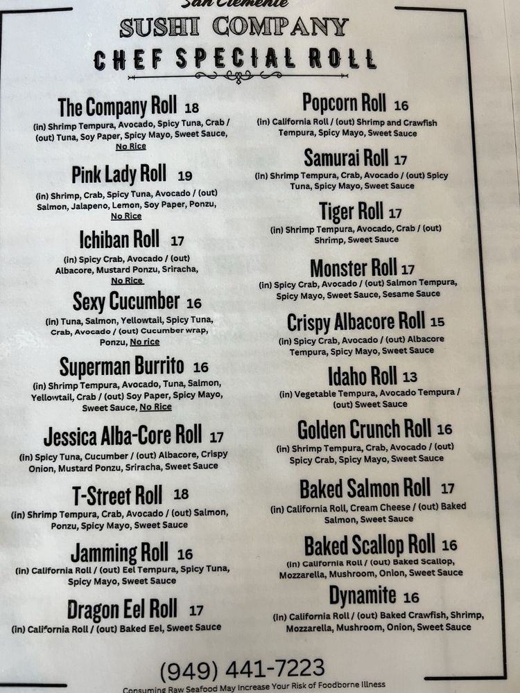 San Clemente Sushi Company offers a diverse menu with high-quality sushi options. Located in San Clemente, CA, this restaurant provides a comfortable atmosphere and excellent customer service. Customers praise the fast service and delicious food, making it a must-visit for sushi enthusiasts. The menu includes unique dishes like poke nachos and a special pineapple habanero sauce that customers rave about. The restaurant is known for its reasonable prices without compromising on quality, making it a popular choice for those looking for a great sushi experience. With complimentary parking and a welcoming ambiance, San Clemente Sushi Company is a top pick for a casual dining experience with friends and family.